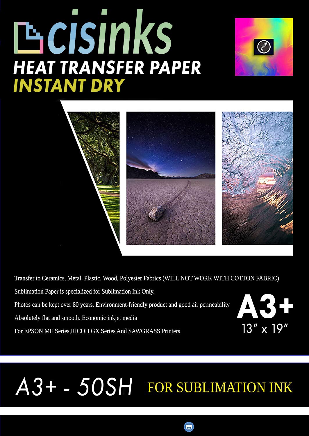 SUBLIMATION TRANSFER PAPER INSTRUCTIONS: Our Heat Transfer Paper is intended for doing heat transfers using SUBLIMATION INK only. It's coated with a special chemical that transfers any printed images onto another material or surface when placed under heated pressure. Such paper is popular among individuals who want to place logos, and other printed graphics onto surfaces or clothing To identify the printing side, moisten your finger tips and pinch a corner of the paper, the side of your finger that sticks to the paper is the side that you print on. *Due to the size of the paper, bigger papers tend to curl and cause paper jam. Make sure you flatten your papers by curling your paper sheets to the opposite side 1. Turn on the heat press machine and allow it to heat up to the desired temperature 2. Select "Mirror Print" or "Flip Horizontal" option when printing 3. After printing, wait at least 3 minute to let the ink dry thoroughly. (Do not touch the printed image) 4. Place the sublimation heat transfer paper onto the surface or garment with the printed side facing down 5. Heat press around 20-40 second depending on the pressing surface 6. After pressing, wait about 2 minutes to cool down the pressed surface and peel the paper. If image has not transferred, repeat the previous step Here are some pressing temperature and time for common materials - T-Shirts 100% Polyester | 400¢XF | 30 - 40 seconds - Polyester / Mouse Pads | 400¢XF | 45 seconds - Metal | 400¢XF | 60 seconds - Other metals (Silver / Bronze) | 375¢XF - 400¢XF | 60 seconds - Ceramic Mugs | 350¢XF - 400¢XF | 150 - 210 seconds - Ceramic and Glass Tiles | 400¢XF | 300 - 720 seconds